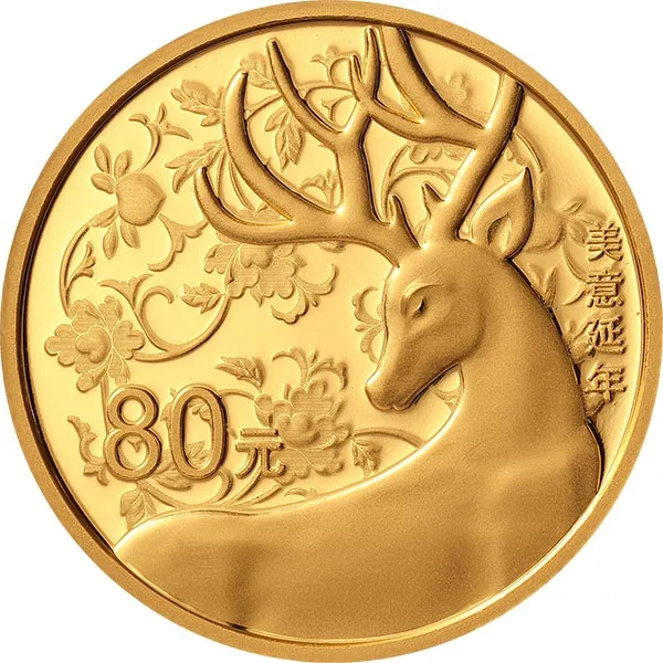 A deer adorned with peaches and auspicious flowers, with the idiom "mei yi yan nian" symbolizing health and longevity, and the face value.