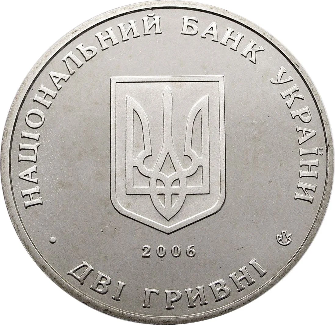 The center features the Small National Emblem of Ukraine above the year 2006. Around the circumference are the inscriptions "НАЦІОНАЛЬНИЙ БАНК УКРАЇНИ" (above) and "ДВІ ГРИВНІ" (below), along with the Mint's logotype.
