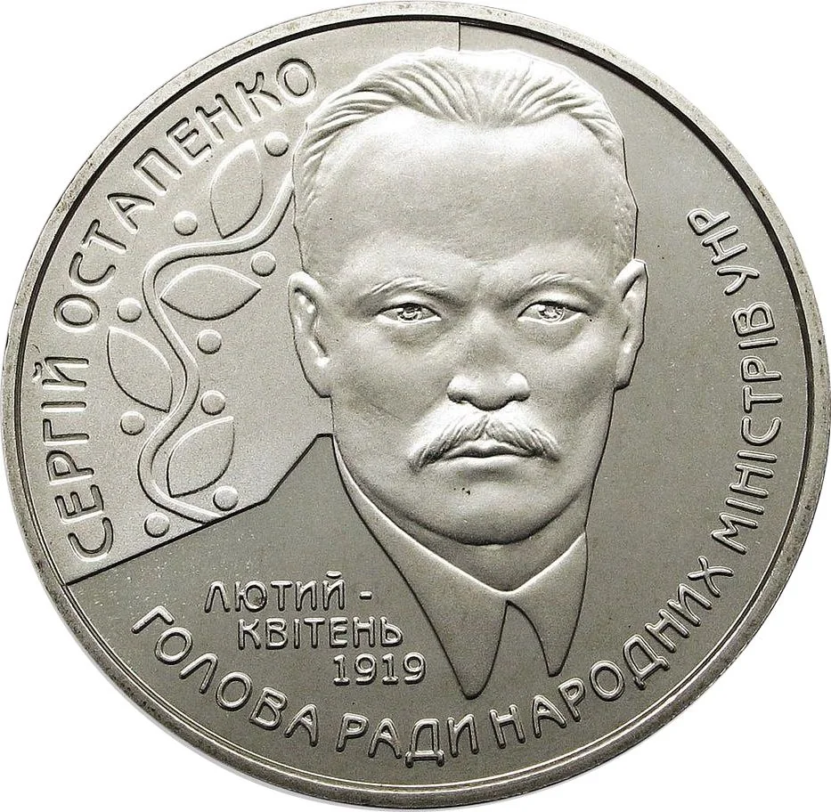 Serhii Ostapenko is portrayed against a stylized ornament. Inscriptions read: "СЕРГІЙ ОСТАПЕНКО"; below in a semicircle, "ЛЮТИЙ - КВІТЕНЬ 1919" and "ГОЛОВА РАДИ НАРОДНИХ МІНІСТРІВ УНР".