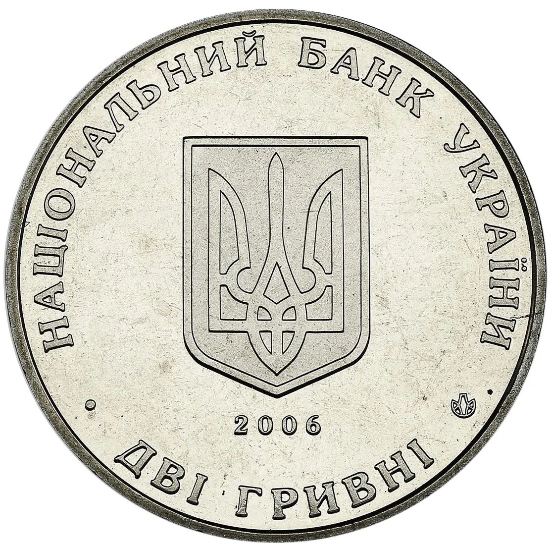 Centered is the Small National Emblem of Ukraine, above the year 2006. Semicircular inscriptions read: "НАЦІОНАЛЬНИЙ БАНК УКРАЇНИ" above and "ДВІ ГРИВНІ" below, along with the Mint's logotype.