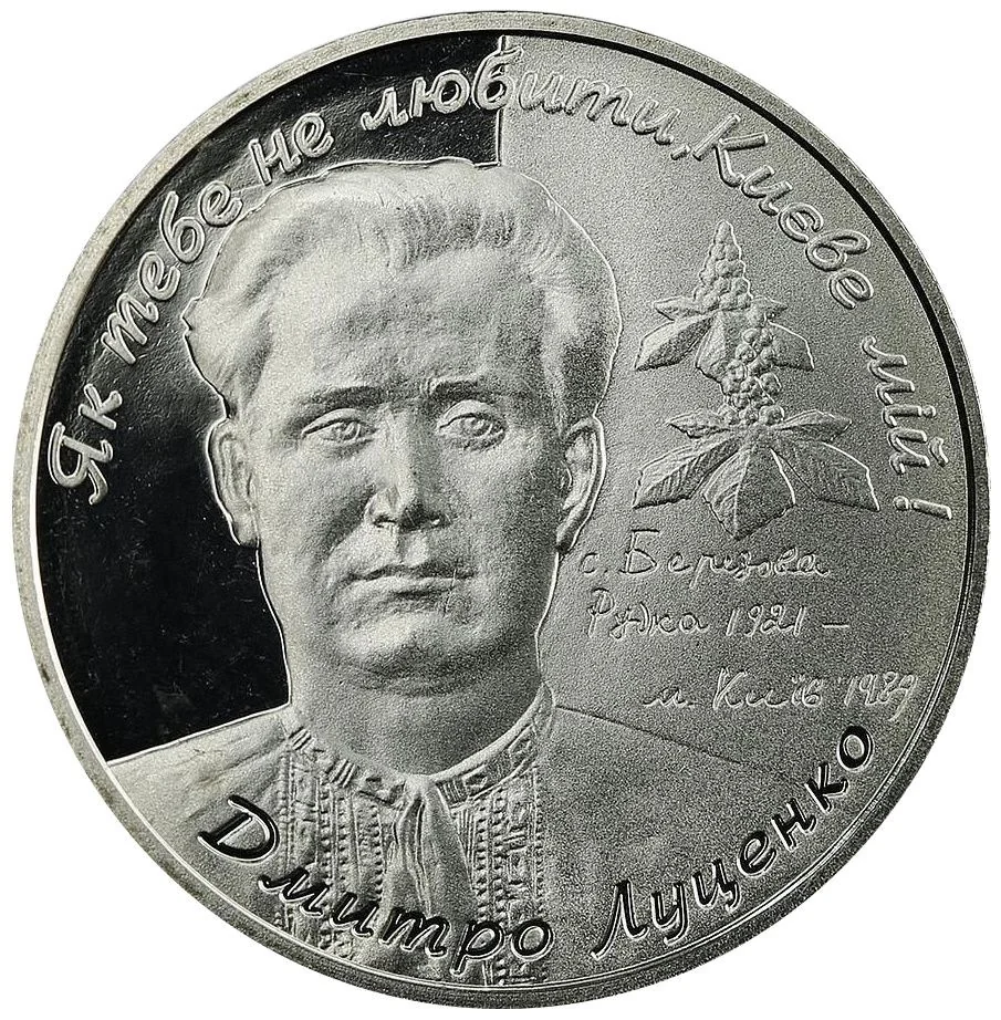 Description: Portrait of Dmytro Lutsenko, with two chestnut blossoms to the right and the text "с. Березова Рудка 1921 - Київ 1989". Around the edge: "ЯК ТЕБЕ НЕ ЛЮБИТИ, КИЄВЕ МІЙ!" (top) and "ДМИТРО ЛУЦЕНКО" (bottom).