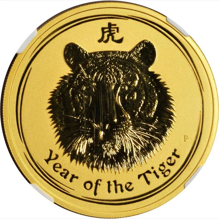 Front-facing tiger head with "Tiger" above, mint mark right, "Year of the Tiger" below.