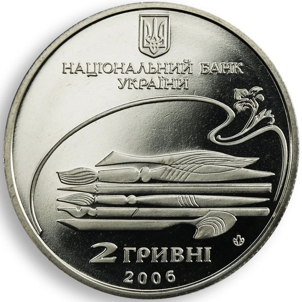 The small National Emblem of Ukraine is shown above the inscription "Національний Банк України." Below this, sculptor's tools are depicted against a stylized palette. At the bottom are the inscriptions "2 ГРИВНІ / 2006" and the Mint's logotype.