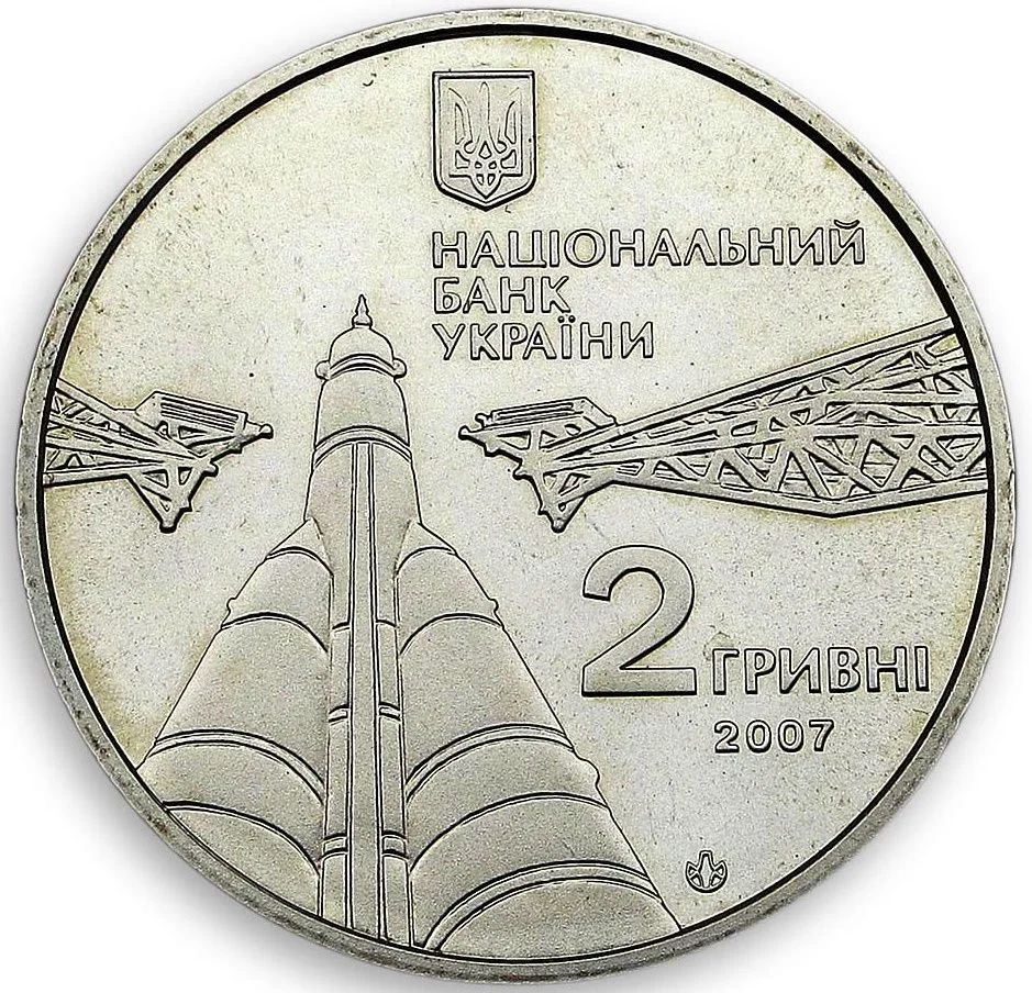 The design features Ukraine's Small National Emblem, the inscription "НАЦІОНАЛЬНИЙ БАНК УКРАЇНИ," and a stylized rocket at launch. Below are the denominations "2 ГРИВНІ / 2007" and the Mint's logotype.
