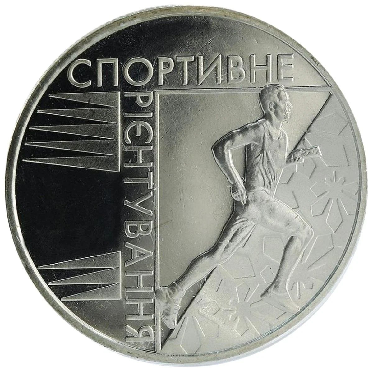 Description: Against a glass background, the Small National Emblem of Ukraine appears above the text "НАЦІОНАЛЬНИЙ БАНК УКРАЇНИ." Flanking this are a sports route marker (right) and a stylized compass (left). Below is the face value "2 ГРИВНІ" and the Mint's logotype.