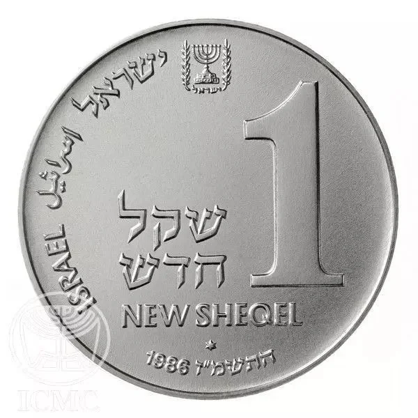 "1 New Sheqel" in Hebrew and English, Israel's emblem, mint year 1986/5747, and "ISRAEL" in Hebrew, English, and Arabic.