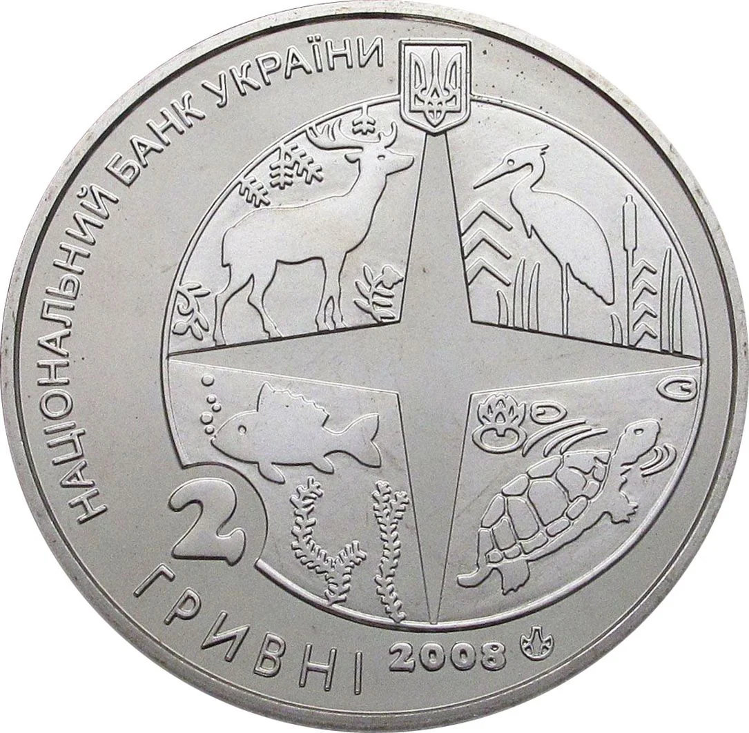 Description: A circle divided by a wind rose symbolizes the zoo's mammals, birds, fish, and amphibians. Above is Ukraine's National Emblem, with inscriptions: "НАЦІОНАЛЬНИЙ БАНК УКРАЇНИ" (semicircle), "2 ГРИВНІ 2008," and the NBU Mint logo.