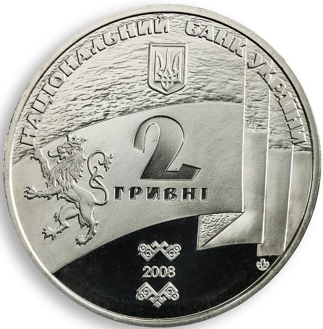 Description: Against the flag background: the semicircular inscription "НАЦІОНАЛЬНИЙ БАНК УКРАЇНИ" above the Small National Emblem, the coin face value "2/ГРИВНІ", a lion from the WUPR coat of arms on the left, and the 2008 issue year with the Mint's logotype below.