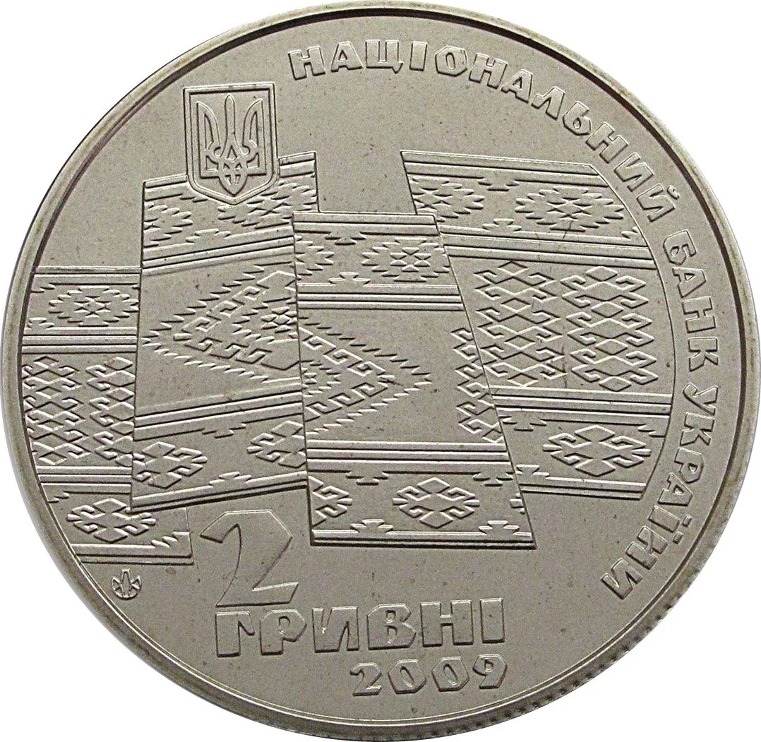 Description: The design features Carpathian-patterned carpets, the Small State Emblem of Ukraine above, and the semicircular inscription "Національний банк України" to the right. Below are the face value "2/ГРИВНІ," the year 2009, and the Mint's logotype.