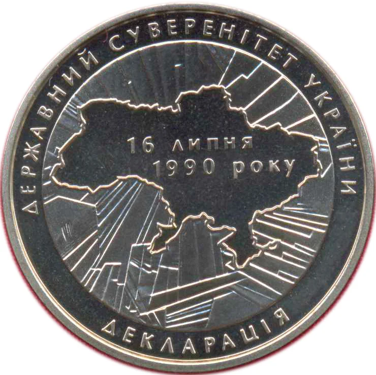 A blank map of Ukraine on a rough relief background symbolizes the difficult path to sovereignty. Inscriptions: "16 July/1990" at the center, "State Sovereignty of Ukraine" above in an arc, and "Declaration" below in a bow shape.