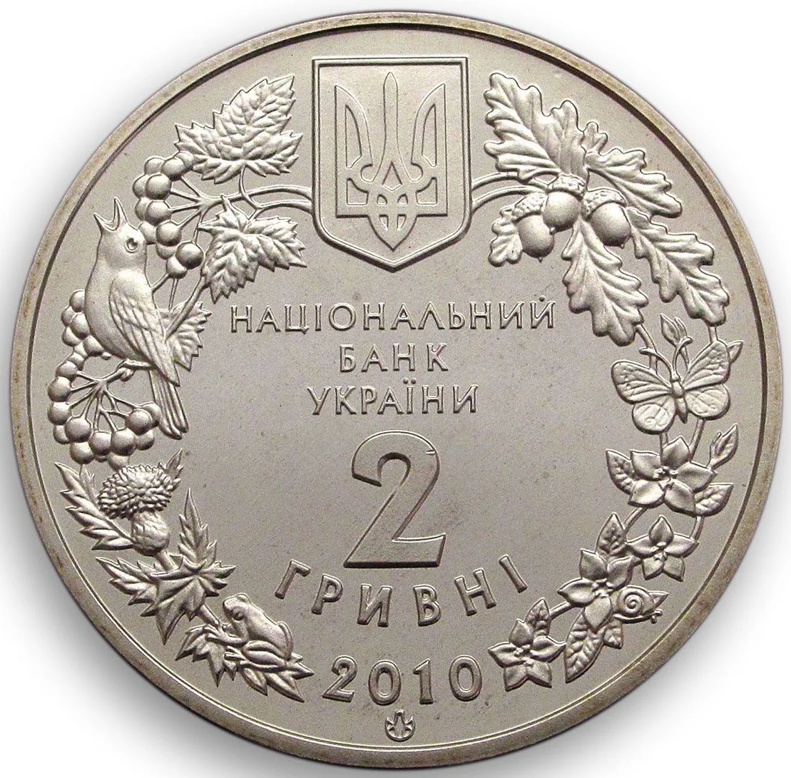 The Ukrainian coat of arms within a wreath of flora and fauna, surrounded by the inscriptions "НАЦІОНАЛЬНИЙ БАНК УКРАЇНИ 2 ГРИВНІ 2010" and the Mint's logo.