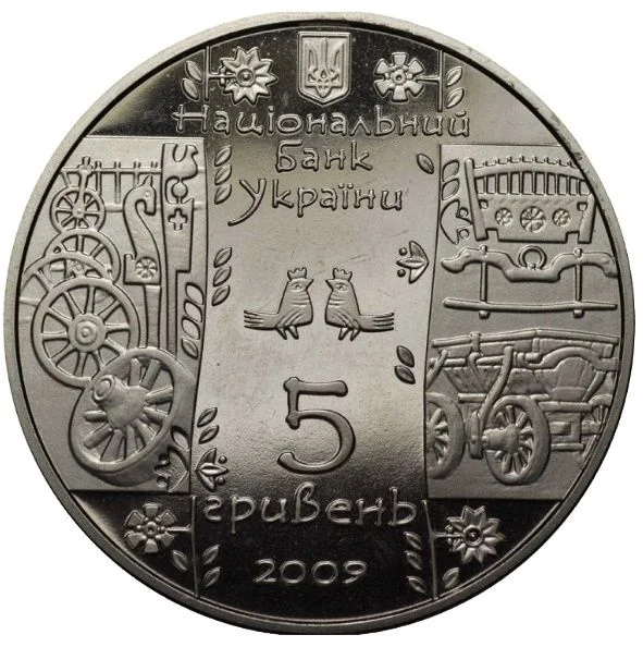 Description: The obverse features the Small Coat of Arms of Ukraine, the inscription "НАЦІОНАЛЬНИЙ БАНК УКРАЇНИ," and a central design of two stylized cockerels flanked by cartwright elements (carts, yokes, wheels, sledges, pins). The ornamental center also bears the denomination "5 ГРИВЕНЬ" and the year "2009."