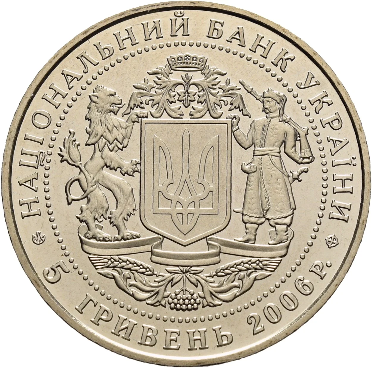 The necklace's circlet features Ukraine's Small National Emblem, supported by a lion and a Cossack within a vegetative ornament, symbolizing the country's integrity. The German silver coin is inscribed: "НАЦІОНАЛЬНИЙ БАНК УКРАЇНИ 5 ГРИВЕНЬ 2006."