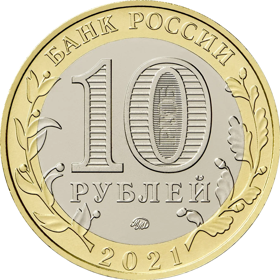 The central disc features "10 РУБЛЕЙ" with a "0" containing hidden images of "10" and "РУБ" that appear at different angles, and the mint mark at the bottom. The ring bears "БАНК РОССИИ" at the top, "2021" at the bottom, and stylized plant twigs extending onto the disc on the sides.