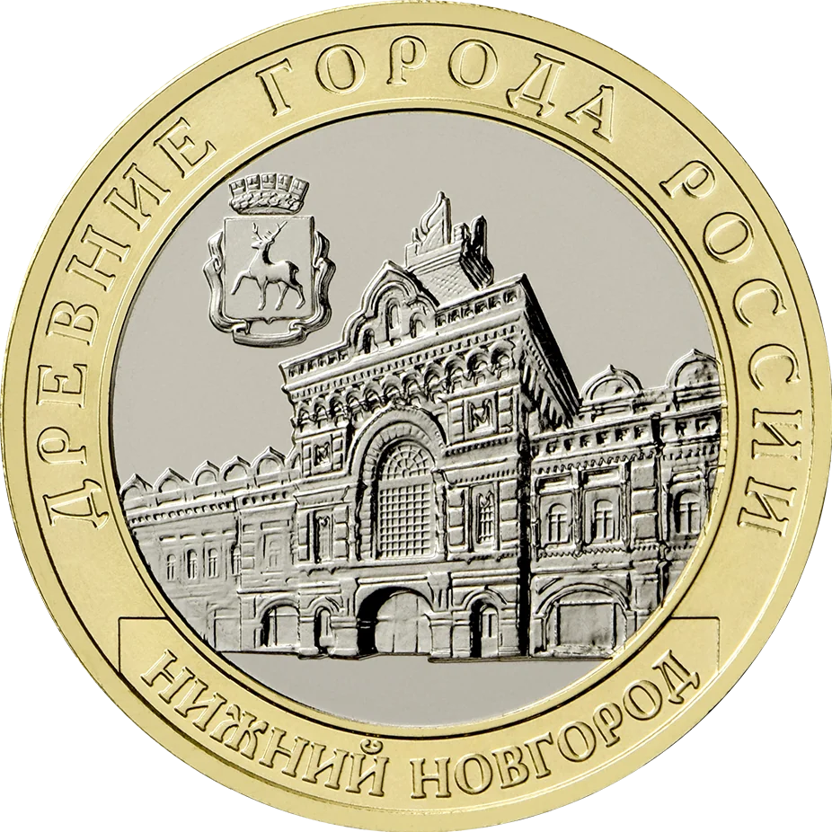 A relief of the Nizhny Novgorod trade fair building, the city's emblem at top left, and an outer ring inscription: "ДРЕВНИЕ ГОРОДА РОССИИ" above and "НИЖНИЙ НОВГОРОД" below.