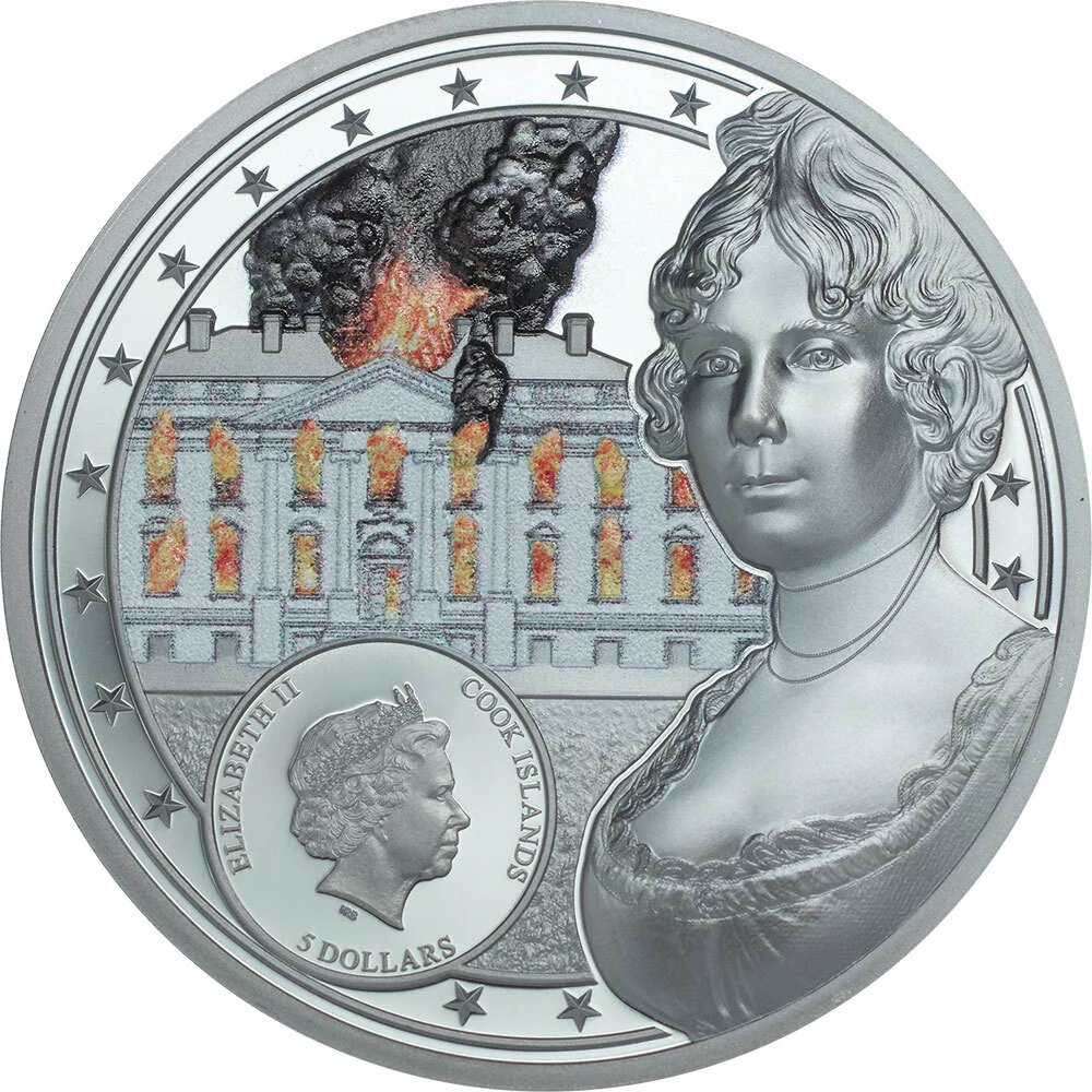 Queen Elizabeth II's effigy, the burning White House in 1812, and Dolley Madison.