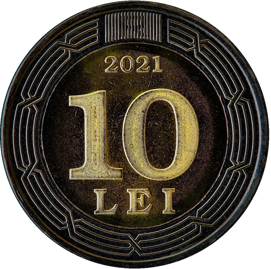 The foreground shows "10 LEI" and "2021." Around the circumference is a decorative engraving, while the top exergue features a latent image monogram "RM" for Republica Moldova. The digit "1" includes the micro-engraved legend "BNM."