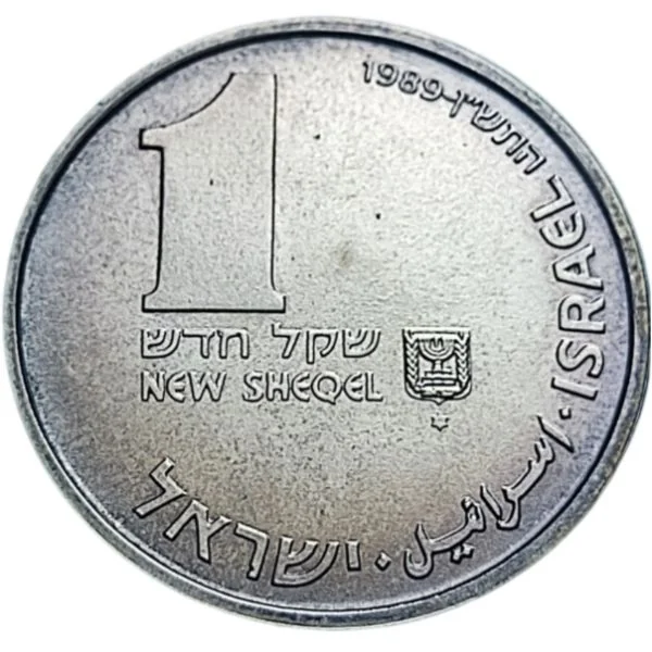 The coin's face value appears in Hebrew and English: "1 New Sheqel" on the Silver B.U. coin and "2 New Sheqalim" on the Silver Proof. To the right is the State Emblem, with the mint year (1989 / 5750) and "ISRAEL" in Hebrew, English, and Arabic above.
