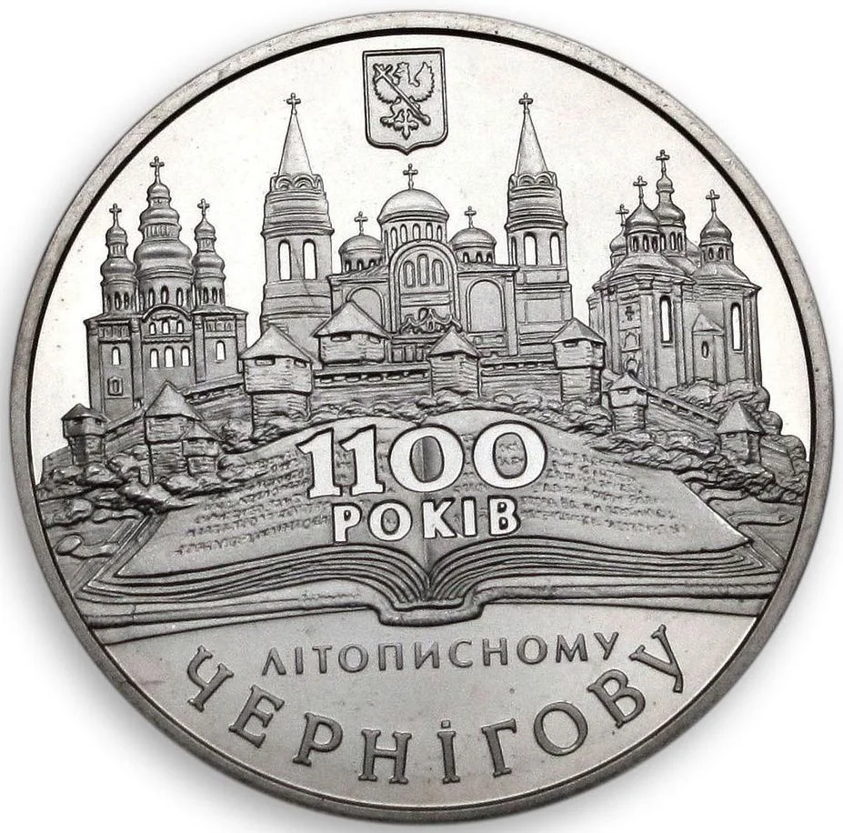 Behind the open book lies the ancient Chernihiv burg, topped by the city's coat of arms. On the book's pages are the inscriptions: "1100 РОКІВ" and "ЛІТОПИСНОМУ ЧЕРНІГОВУ".