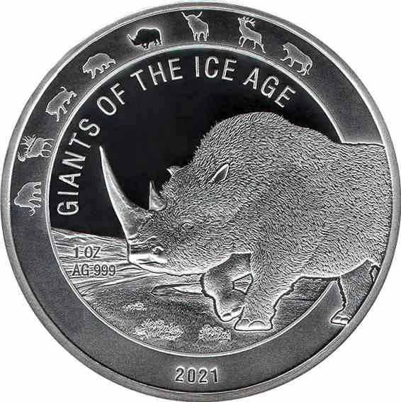 Features a Woolly Rhinoceros. Includes legends of the ICE AGE GIANTS, plus date, purity, weight, and animal outlines for the series.