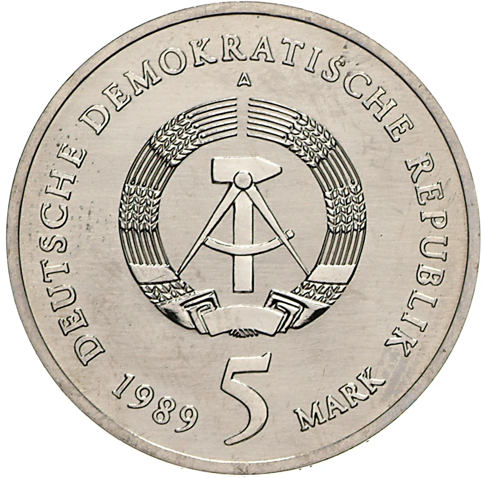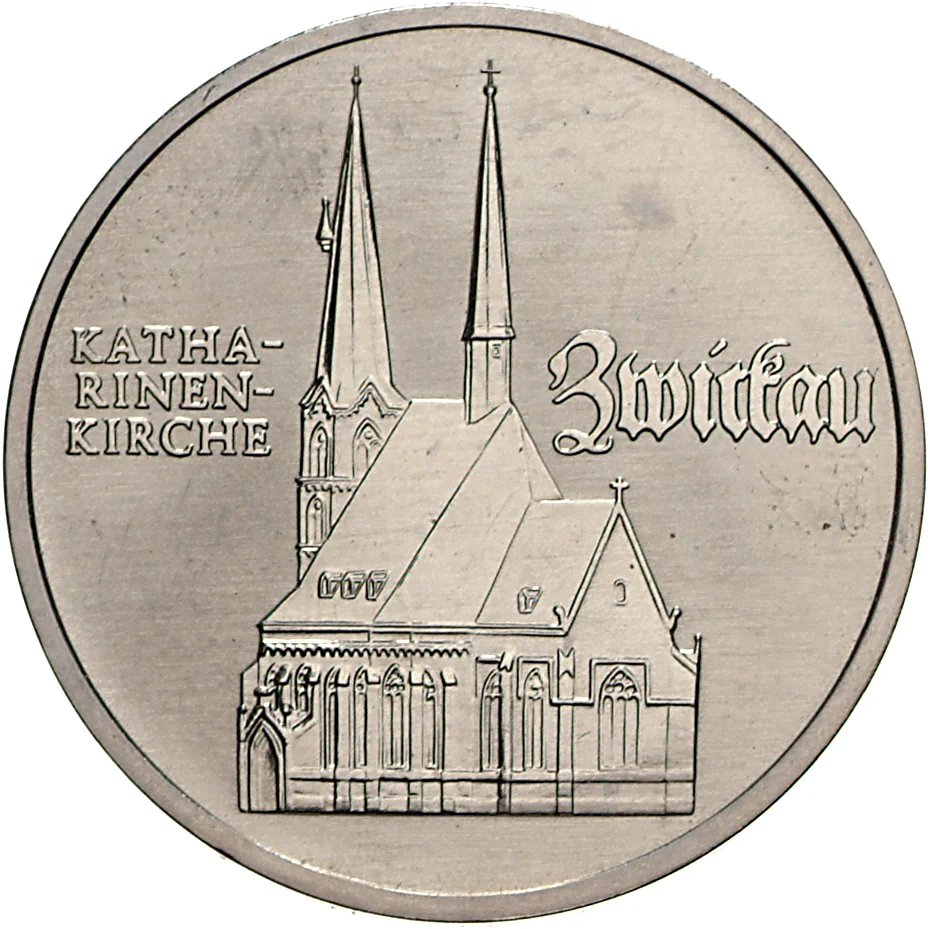 This coin honors the 500th birthday of Thomas Müntzer, a key Reformation leader. It features an illustration of Zwickau's Saint Catherine's Church in Saxony.
