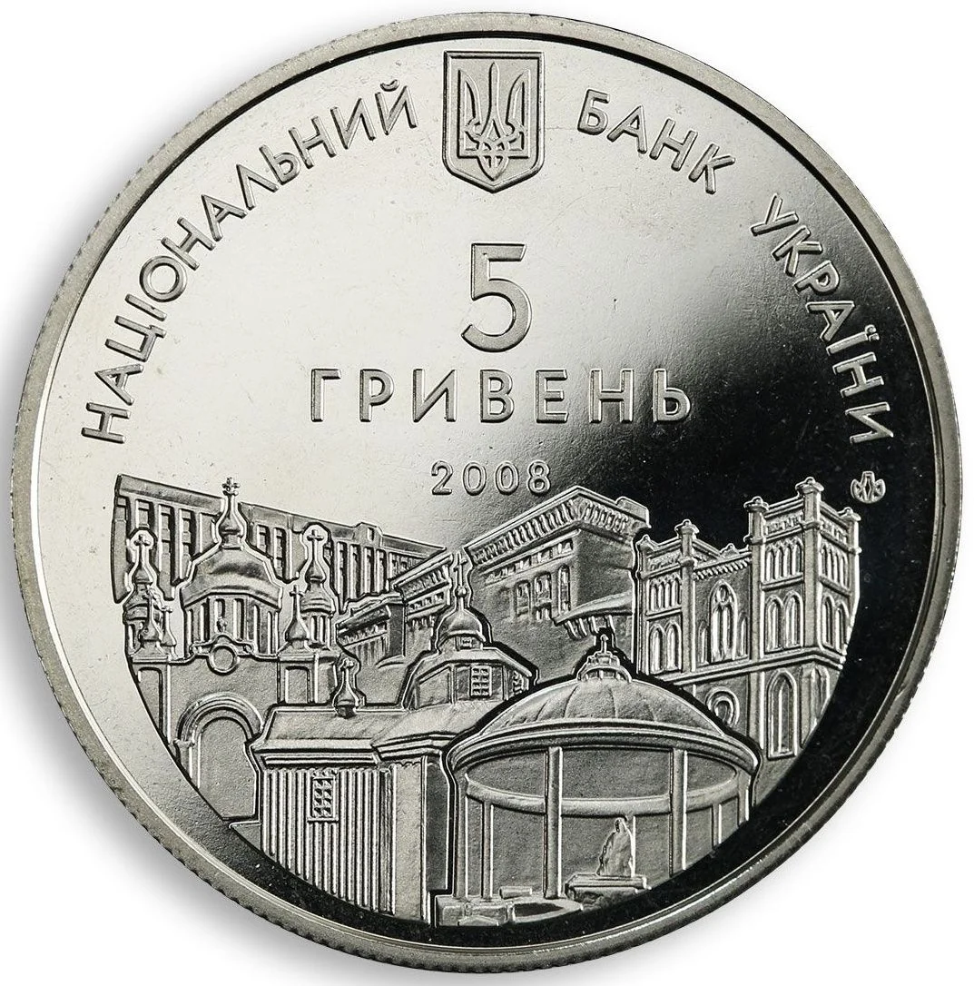 Description: Featuring historic and architectural monuments, including monuments to Mariia Rivnenska Nesvytska, the Assumption and Intercession Cathedrals. Above is Ukraine's small national emblem and the semicircular inscription "НАЦІОНАЛЬНИЙ БАНК УКРАЇНИ". Below are the legend "5 ГРИВЕНЬ 2008" and the Mint's logotype.