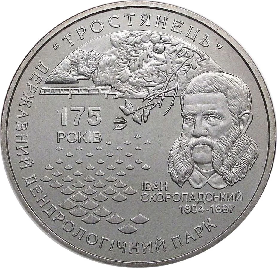 Description: A portrait bust of the arboretum's founder, Ivan Skoropadskyi (1804-1887), against a pond and park. To the left is "175 YEARS," with "State Arboretum" and "Trostianets" above.