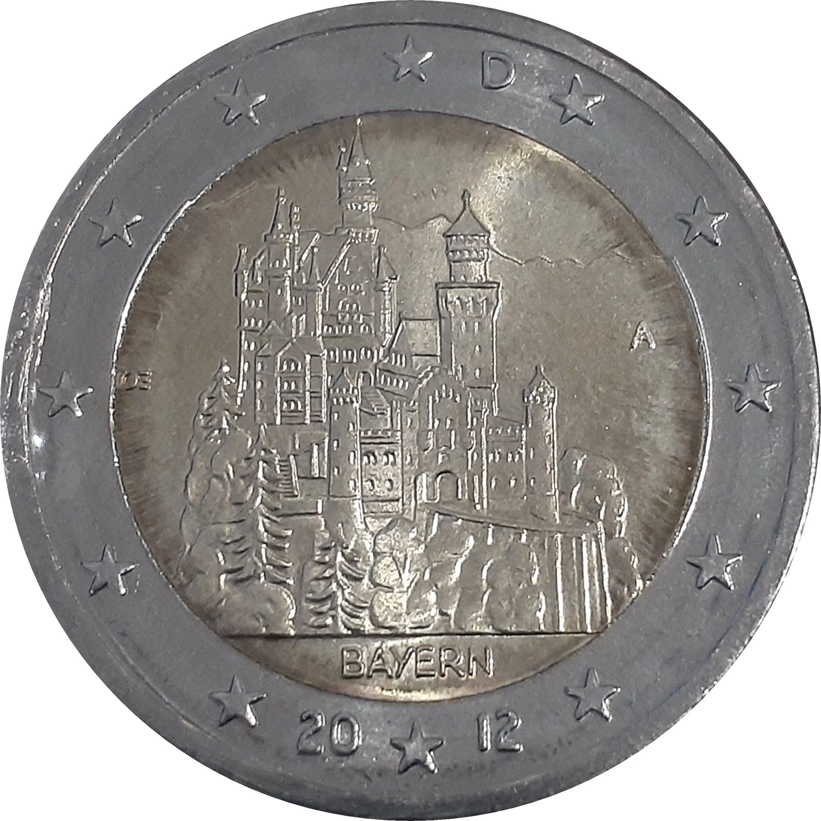 Designed by Erich Ott, this commemorative 'Bavaria' coin features the famous eastern view of Neuschwanstein Castle, including its gatehouse, towers, and the mountain backdrop over the Pöllatschlucht. 'BAYERN' links the castle to the state. The mintmark and artist's initials are in the center, with the EU stars, year '2012', and country code 'D' on the outer ring.