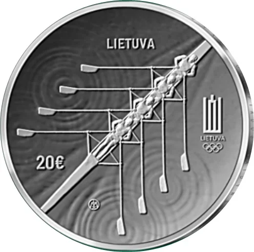 The obverse shows a stylized quadruple scull, surrounded by the Lithuanian Olympic Committee logo, "LIETUVA," €20, and the Lithuanian Mint mark.