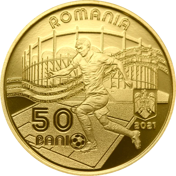 A football-themed graphic with microtext "CAMPIONATUL EUROPEAN DE FOTBAL" on three rows, an arched "ROMANIA", the value "50 BANI", Romania's coat of arms, and the year "2021".