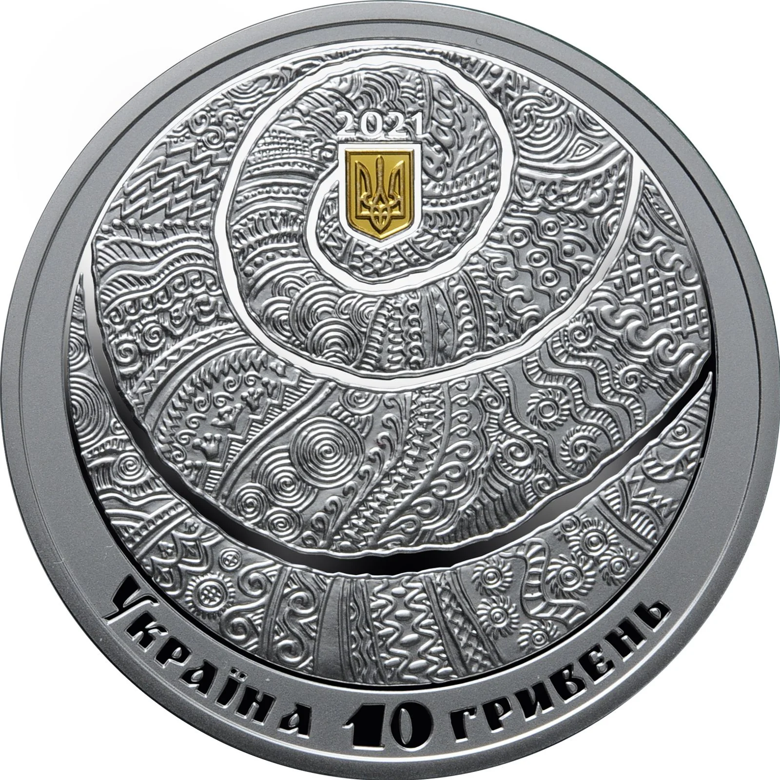 Above Ukraine's small coat of arms (2021) are the inscriptions УКРАЇНА and 10 ГРИВЕНЬ. The central spiral, decorated with symbols and amulets, represents the Universe's evolution, continuity, and the rhythm of life.