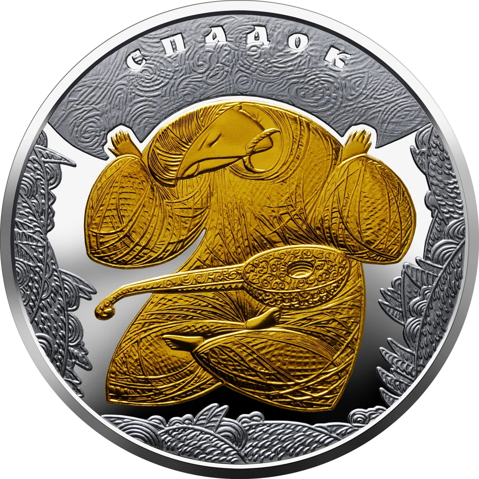 A gold-plated Cossack Mamay, symbolizing the Ukrainian spirit and love of freedom, is surrounded by stylized landscapes. He holds a stylized sky, representing Ukrainian culture and centuries of heritage, under the legend СПАДОК (inheritance).