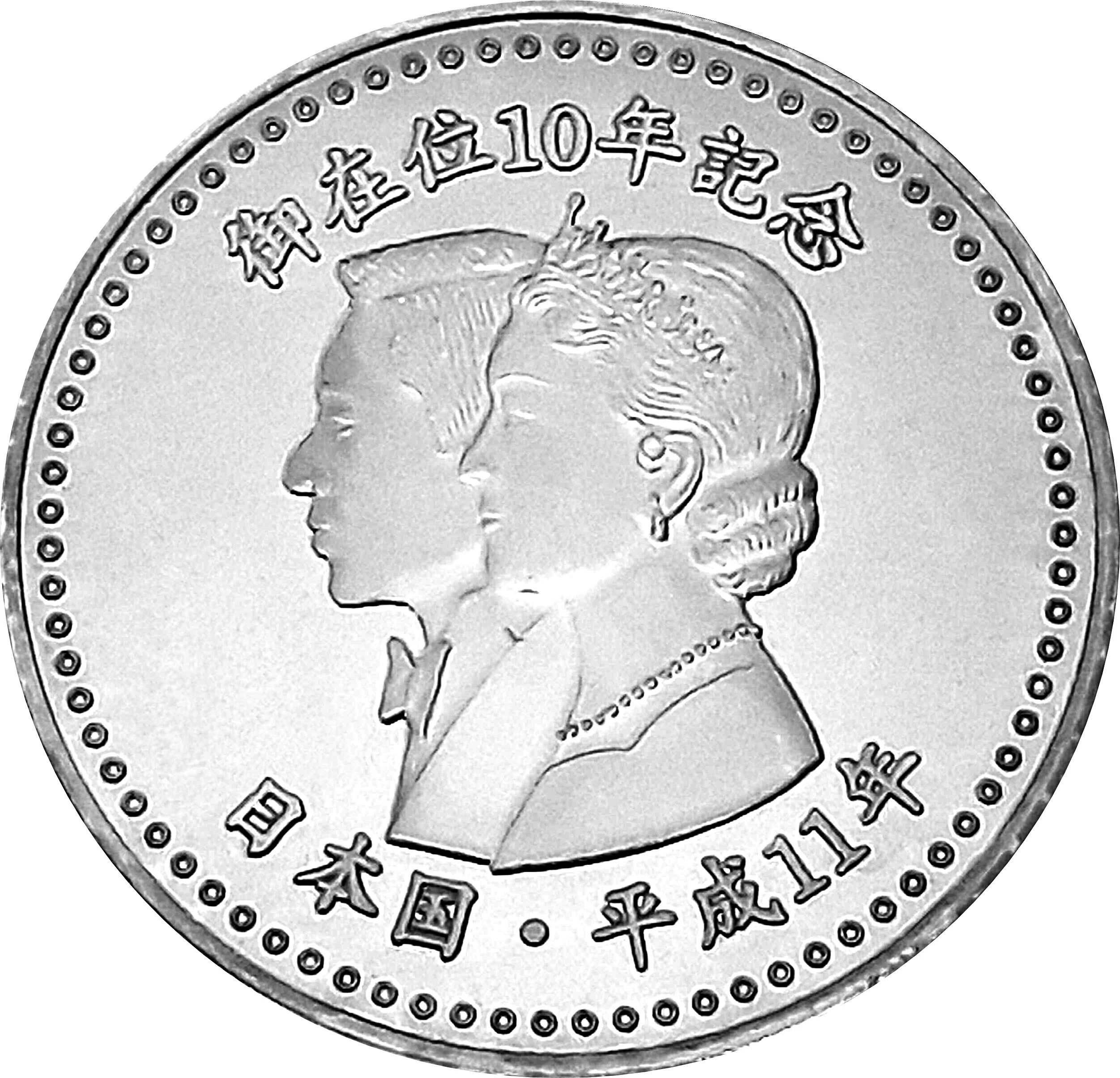 Conjoined busts of the Japanese Emperor and Empress, facing left.