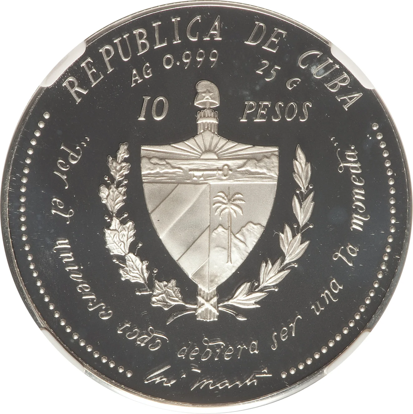 Description: Cuban coat of arms with curved country name above, weight and fineness below. Face value tops the arms, the motto curves on the sides, "PATRIA Y LIBERTAD" is at the bottom, and José Martí's signature is in the exergue.