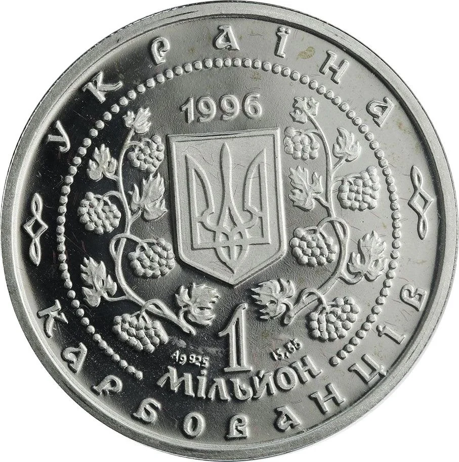 Description: The small State Emblem of Ukraine, framed by guelder-rose sprays, is centered on the coin. Above it is the year 1996. The circumference features the inscriptions УКРАЇНА above and 1 МІЛЬЙОН КАРБОВАНЦІВ below. On the silver version, Аg 925 and 15,55 (pure weight) appear under the sprays.