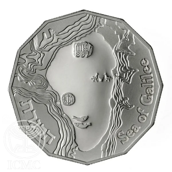An aerial view of the Sea of Galilee (Kinneret in Hebrew) with artifacts: a Tiberias coin (2nd c. CE), zodiac mosaic from Hamat Tiberias (3rd-4th c. CE), stone relief from Capernaum (3rd-4th c. CE), and mosaic from Kursi.