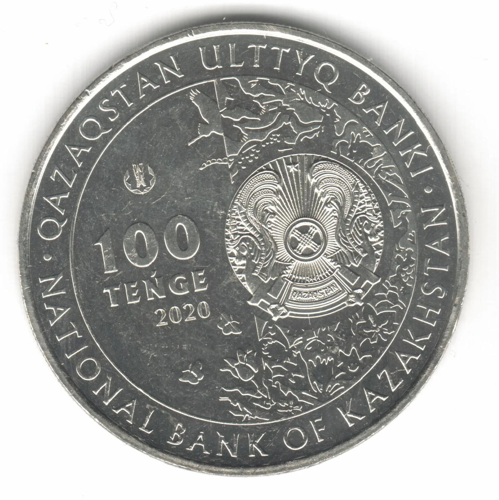 The coin's obverse features Kazakhstan's state emblem surrounded by a flora and fauna collage, the National Bank logo, and the denomination "100 TEŃGE."