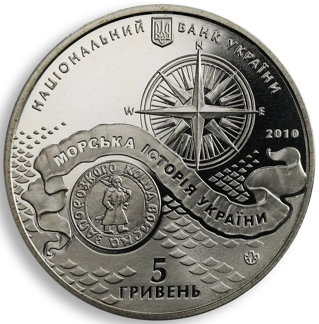 The obverse features Ukraine's Small Coat of Arms and the inscription "НАЦІОНАЛЬНИЙ БАНК УКРАЇНИ." Below, a wavy stripe with "МОРСЬКА ІСТОРІЯ УКРАЇНИ" divides the field: above is a wind rose, below is the seal of the Zaporozhian Host. To the right of the stripe is the year 2010, and below are the Mint logo and the face value "5 ГРИВЕНЬ."