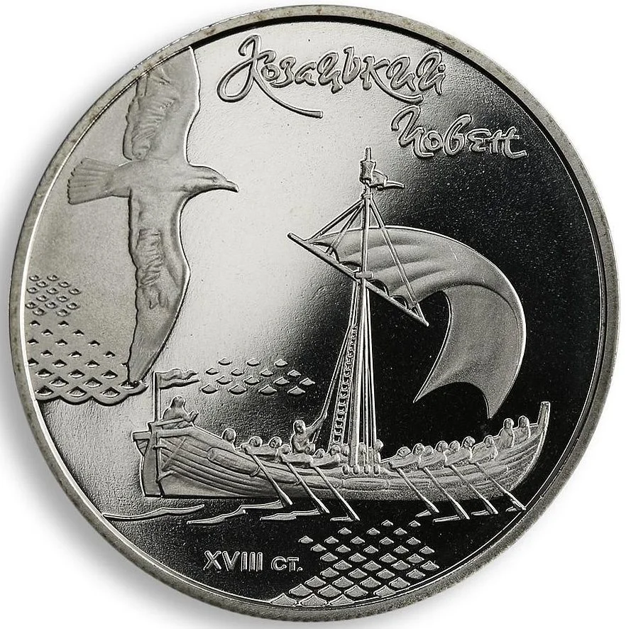 An 18th-century Cossack boat under sail with a gull, symbolizing water.