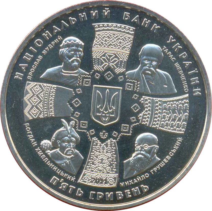 Description: Ukraine's Small Coat of Arms is centered among cruciform rushnyks (embroidered towels). Between the rushnyks are portraits of historic figures: YAROSLAV THE WISE, TARAS SHEVCHENKO, MYKHAILO HRUSHEVSKY, and BOHDAN KHMELNYTSKY. Below, on a rushnyk background, is the minting year 2011, with semicircular inscriptions: "NATIONAL BANK OF UKRAINE" above and the denomination "FIVE HRYVNIAS" below.