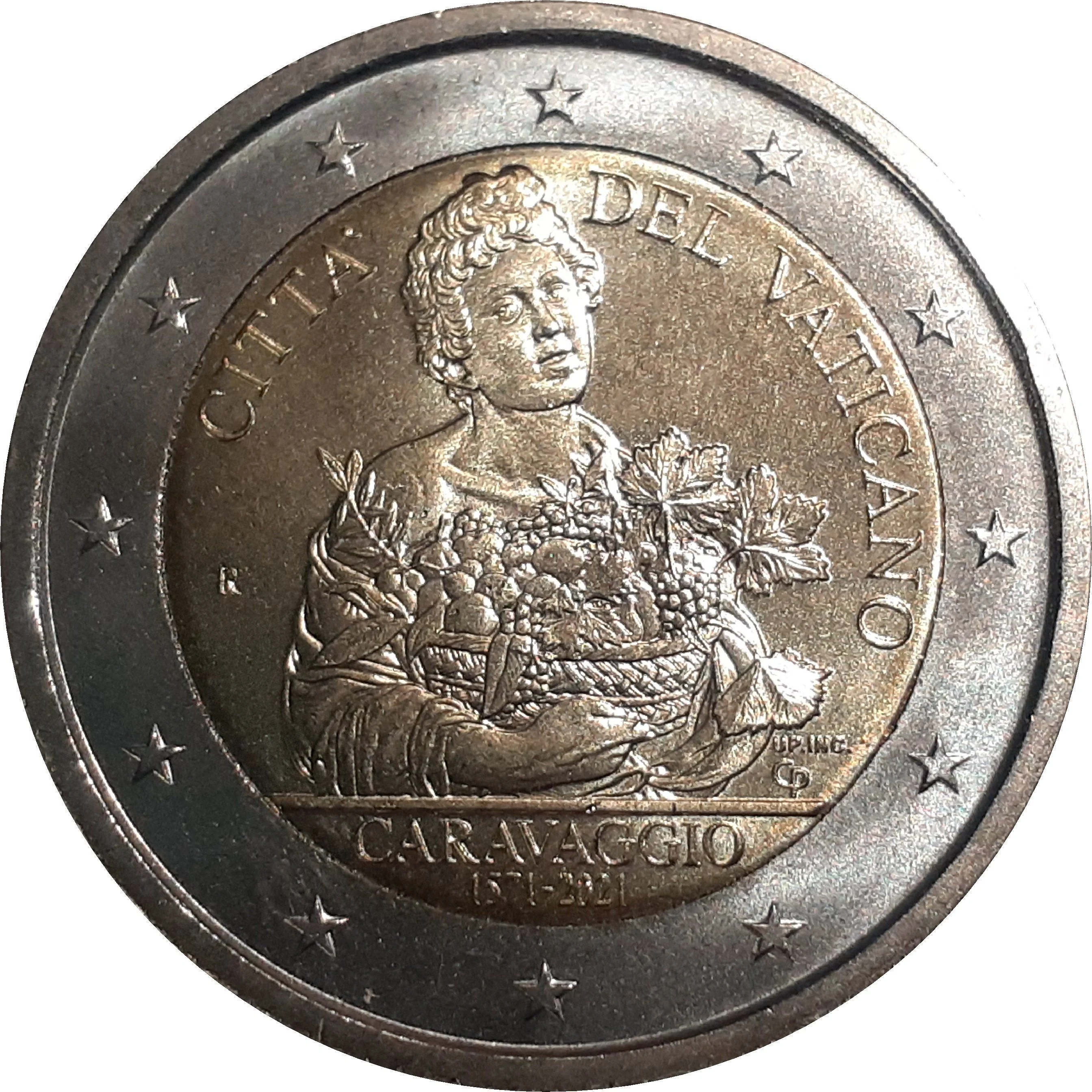Description: The design shows Caravaggio's painting of a boy with a fruit basket. "CITTA’ DEL VATICANO" appears in a semicircle at the top, with the mintmark 'R' at left. "CARAVAGGIO" and the years "1571-2021" are at the bottom, with the artist's initials "CP" at bottom right. The outer ring features the 12 stars of the European flag.