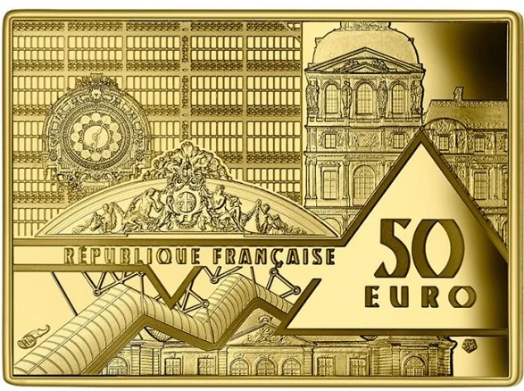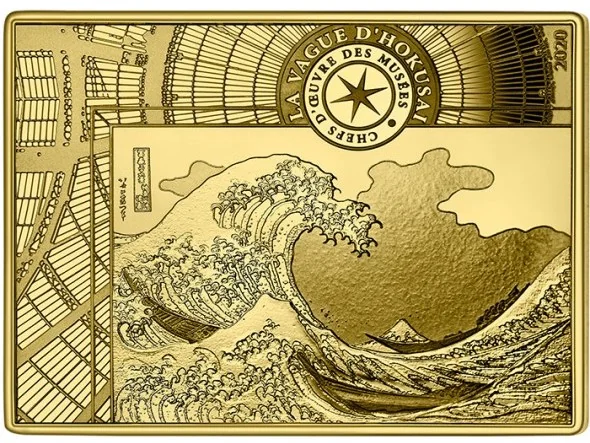 The coin's face integrates The Wave print, with the Grand Palais nave as its backdrop. The "masterpiece of museums" stamp blends with the dome, while the artwork and artist names complete the design. The year 2020 is at the top right.
