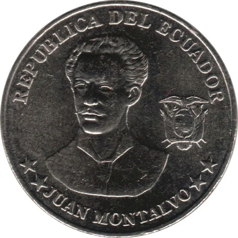 Ecuador: coat of arms, portrait, and writer Juan Montalvo.