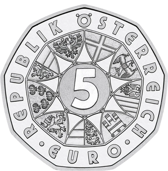 Austria's provincial coats of arms encircle the "5 EURO" value, surrounded by "REPUBLIK ÖSTERREICH", inspired by the historic 50 schilling coin.