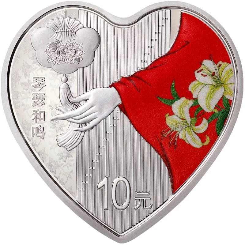 A woman's hand with lily-patterned sleeves holds a sachet against a se backdrop, featuring the idiom "qin se he ming" and the face value.