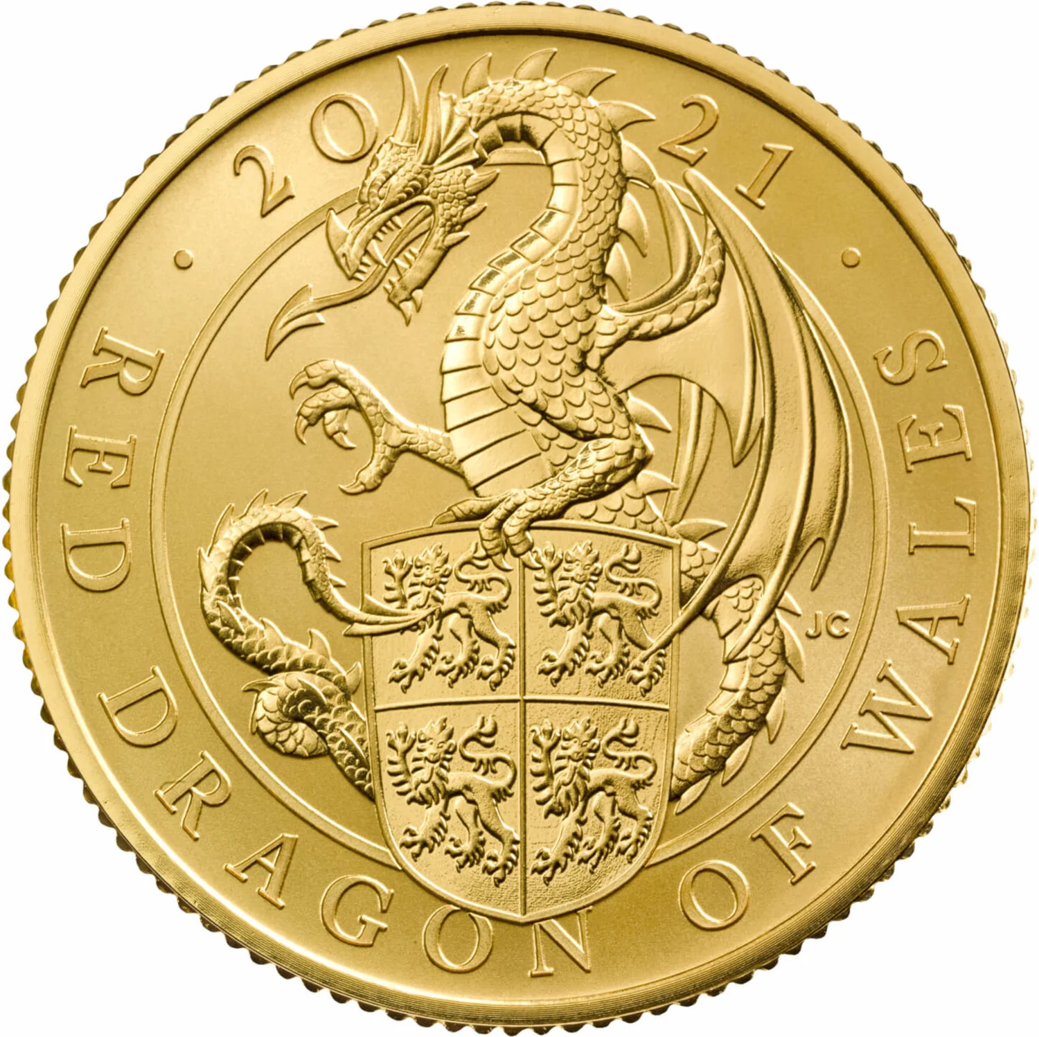 Welsh dragon atop Llewelyn the Great's shield with rampant lions, encircled by legend.