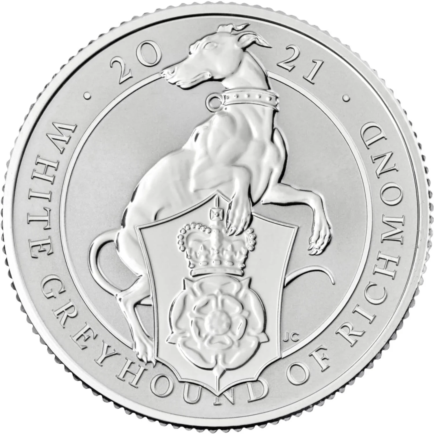 White Greyhound of Richmond with heraldic badge, encircled by legend.