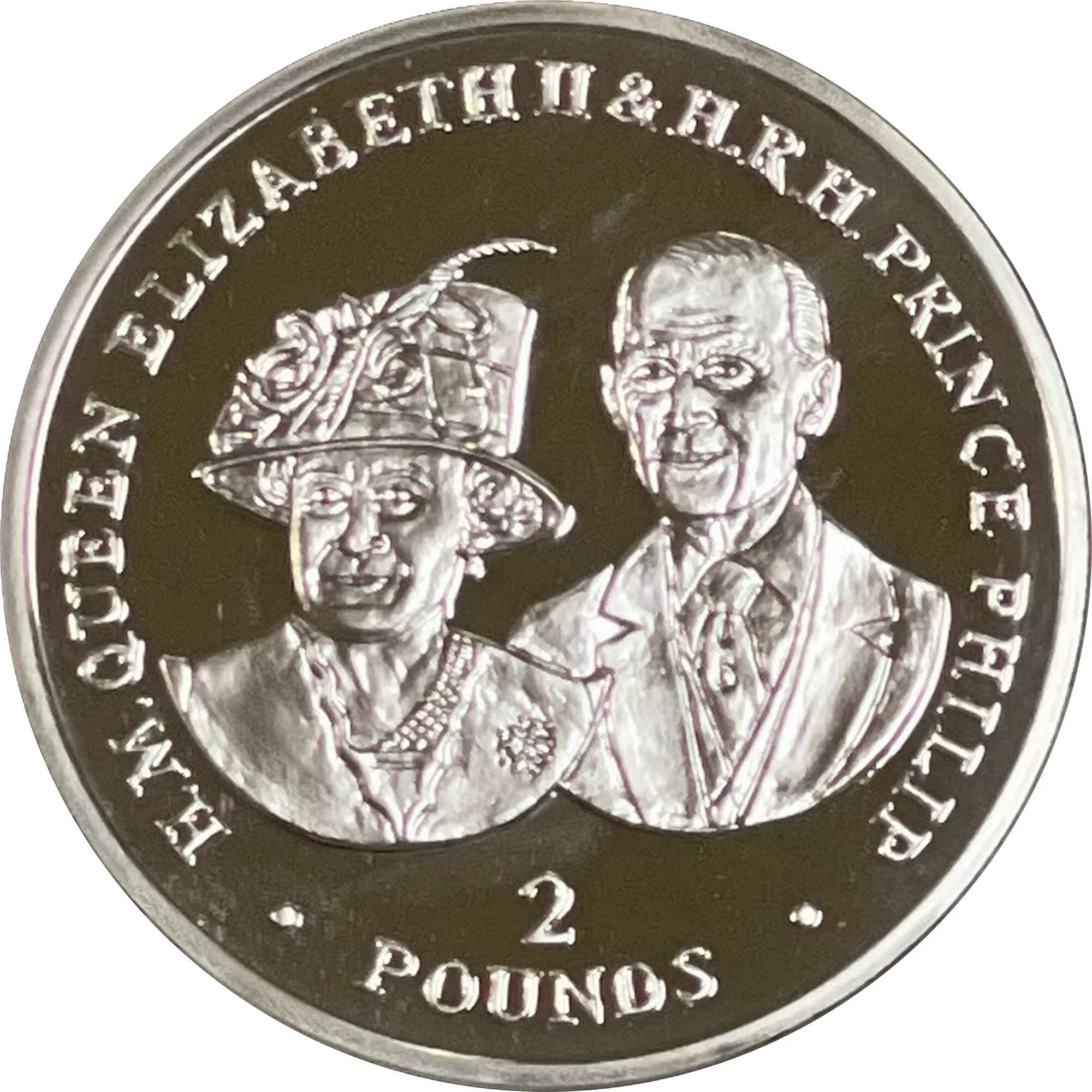 Profile of Queen Elizabeth II and Prince Philip, PM mintmark near her back.
