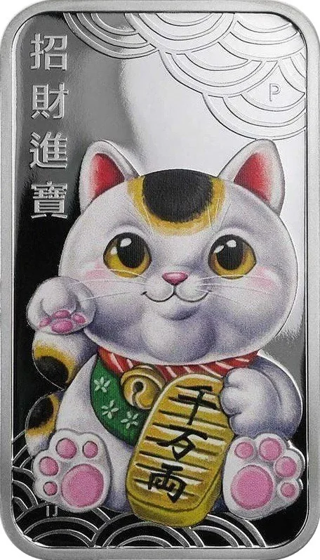 A white lucky cat raising its right paw for wealth, holding a gold koban, with Chinese characters for “ushering in wealth and prosperity.”