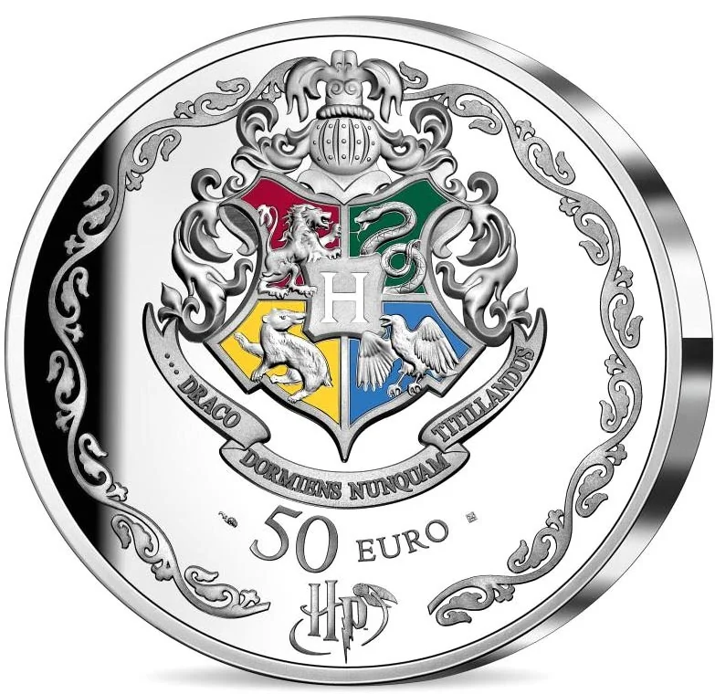 Hogwarts coat of arms with mascots on a colored field.